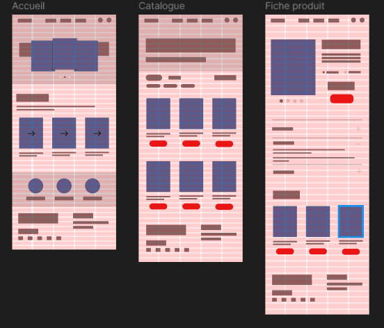 J’ai ensuite travaillé sur Figma. J’ai d’abord créé une page “idées” qui me sert de moodboard (couleurs, styles d’UI, formes, ambiances…), puis j’ai commencé les wireframes des pages principales : accueil, catalogue, fiches produit. Je travaille page par page, en posant d’abord les grandes zones et les blocs de contenu avant de réfléchir plus en détail aux interactions et au design.
