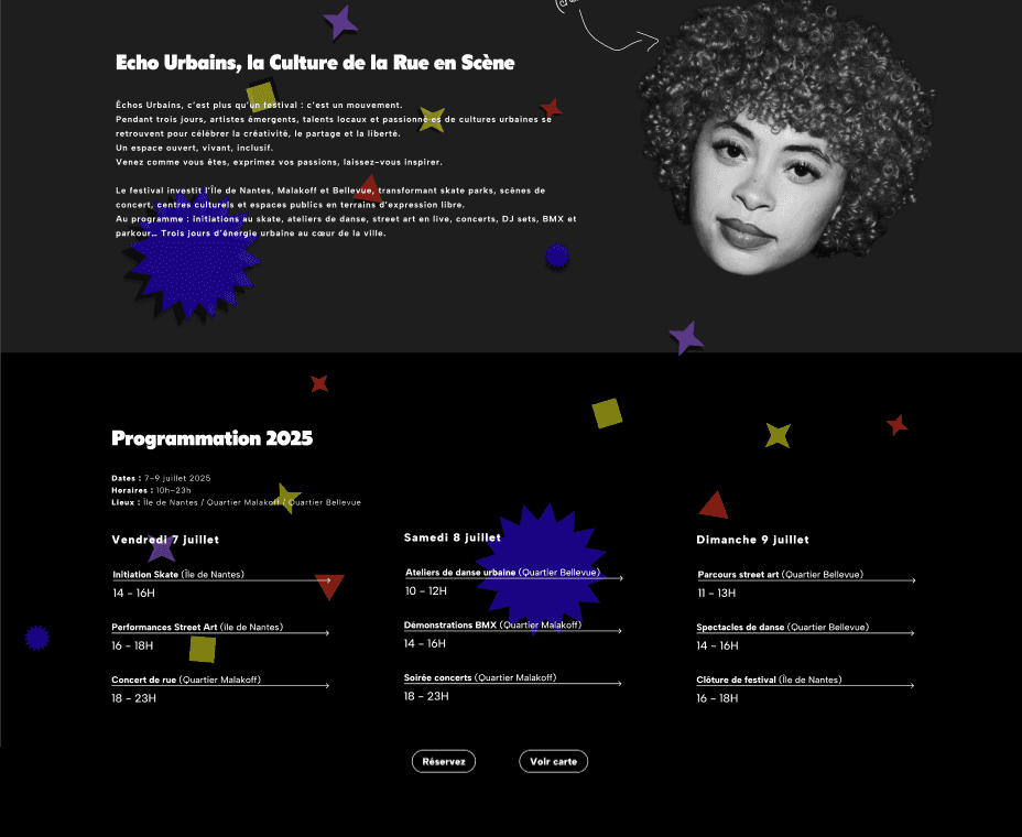 J’ai choisi de partir sur un fond sombre afin de faire ressortir des couleurs vives commele rouge-orangé et le jaune. Ces couleurs apportent du rythme à la page et permettent de créer des repères visuels sans surcharger l’écran. Je les ai intégrées sous forme de formes géométriques pour rendre la navigation plus vivante, avec un style urbain et pop en lien avec l’univers des festivals.