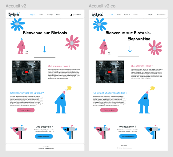 Côté graphisme, je me suis appuyée sur la moodboard déjà créée pour le logo afin de rester cohérente avec l’identité visuelle. J’ai imaginé et réalisé l’ensemble des illustrations du site (sauf le logo), notamment de petits personnages avec une plante sur la tête, inspirés de nains de jardin. J’ai choisi de faire un style simple afin de rester moderne et de ne pas surcharger l’interface.